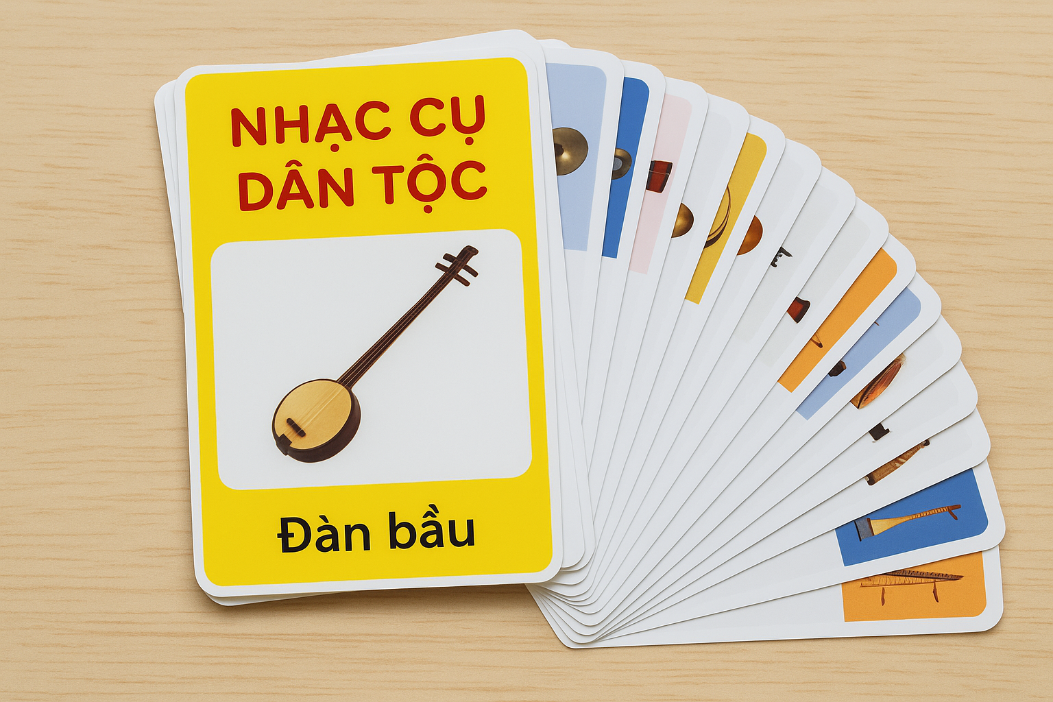 Bộ thẻ minh họa sinh động về nhạc cụ dân tộc và ký hiệu âm nhạc, giúp trẻ ghi nhớ nhanh, dễ tiếp cận và hứng thú học tập.